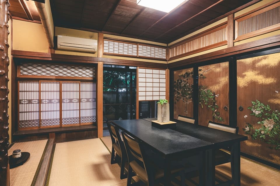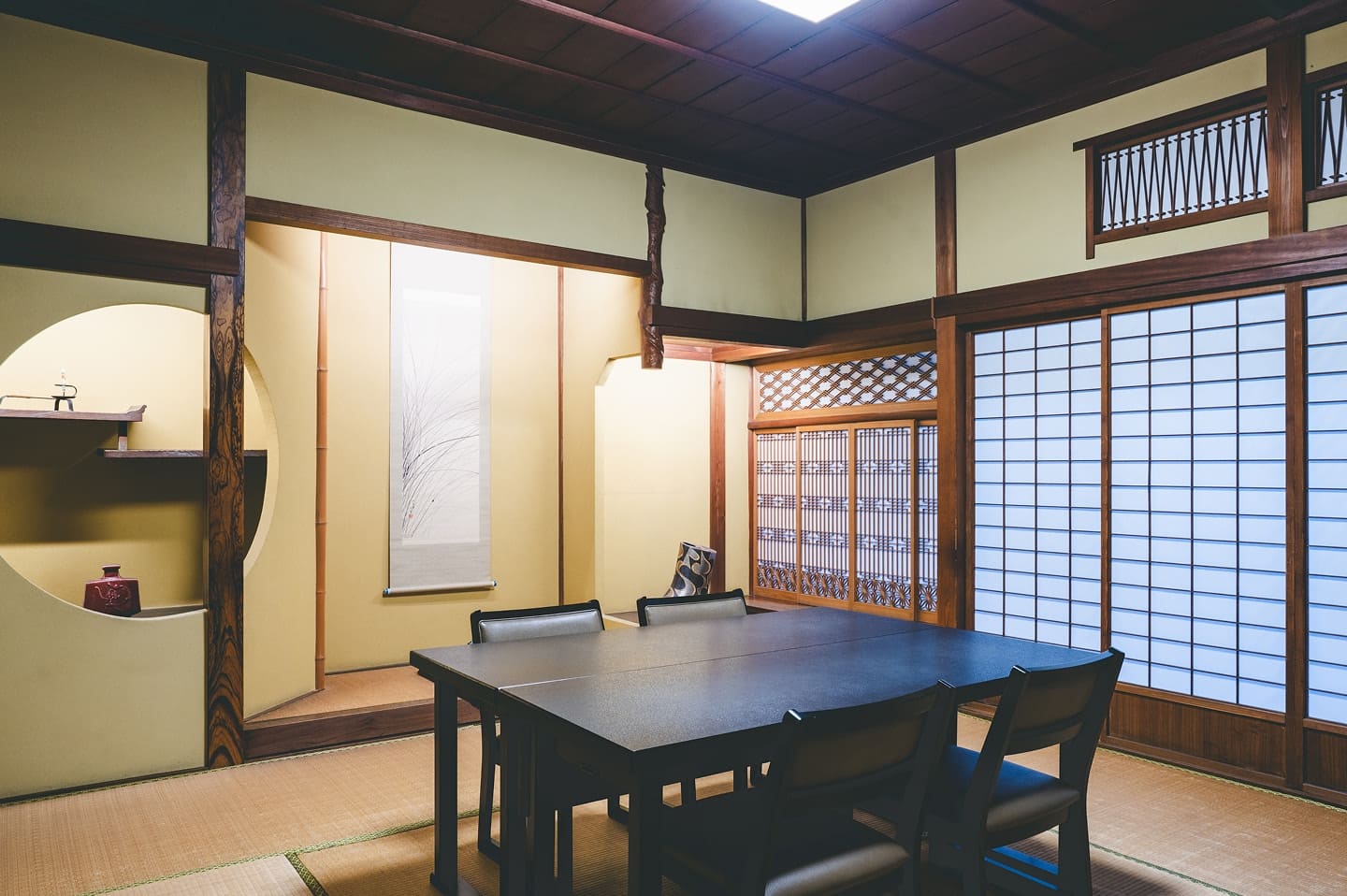 山常楼の建物は、昭和9年(1934年頃)に建てられた、歴史ある料亭建築です。一部には大正時代の趣も残しつつ、当時の若き池田大工が随所に意匠を凝らし、贅を凝らして生まれ変わらせた書院造りの粋が光ります。